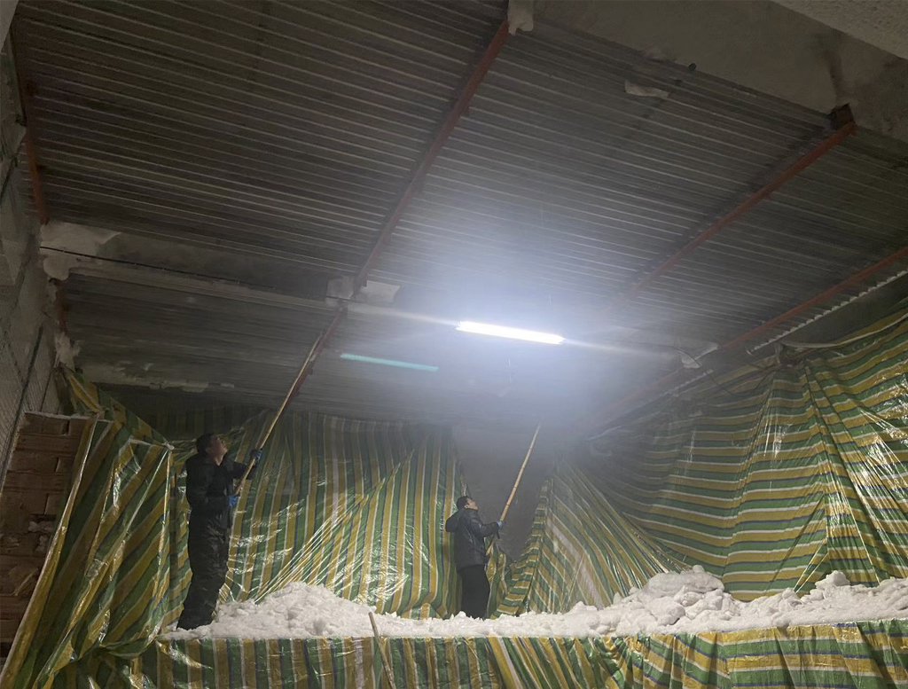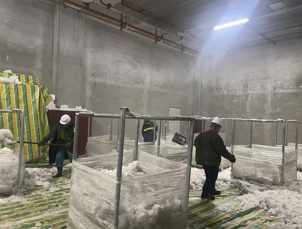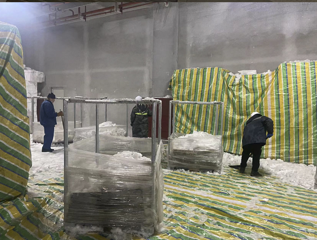 除冰、除霜工作開始前,設(shè)備人員對冷庫設(shè)備進(jìn)行全面檢查,設(shè)置警示標(biāo)志,確保除冰、除霜設(shè)備運(yùn)轉(zhuǎn)正常及作業(yè)人員的人身安全。除霜工作系低溫作業(yè),雖然面臨著手僵直、拿不穩(wěn)、冰面滑、站不穩(wěn)等困難,但是中凱作業(yè)員工一干就是6、7個小時。
